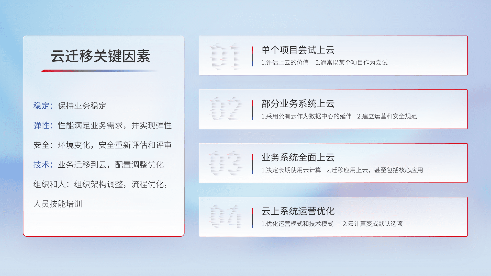 结合实际业务,,,,从规划设计、、、、云平台选型、、云原生改造、、数据迁移、、、、集成交付,,,迁移全过程为客户识别最佳上云路径,,,,做好风险识别管理,,设计网络架构、、、身份权限、、、、安全审计合规、、、操作审计、、日志审计、、、、监控告警策略、、、、多站点容灾设计等,,,对云上基础设施进行整体规划,,,提升IT治理水平,,以满足弹性、、、、高可用、、高性能的需求。。。