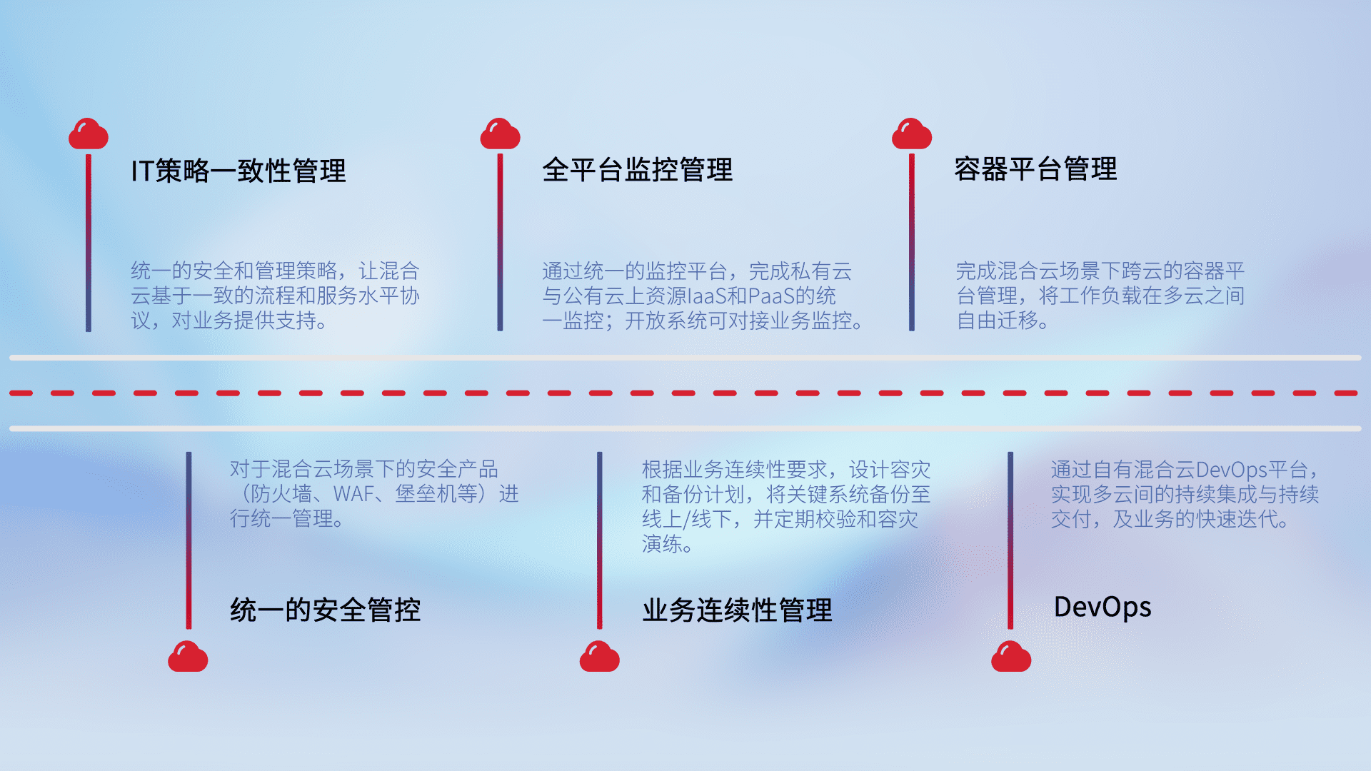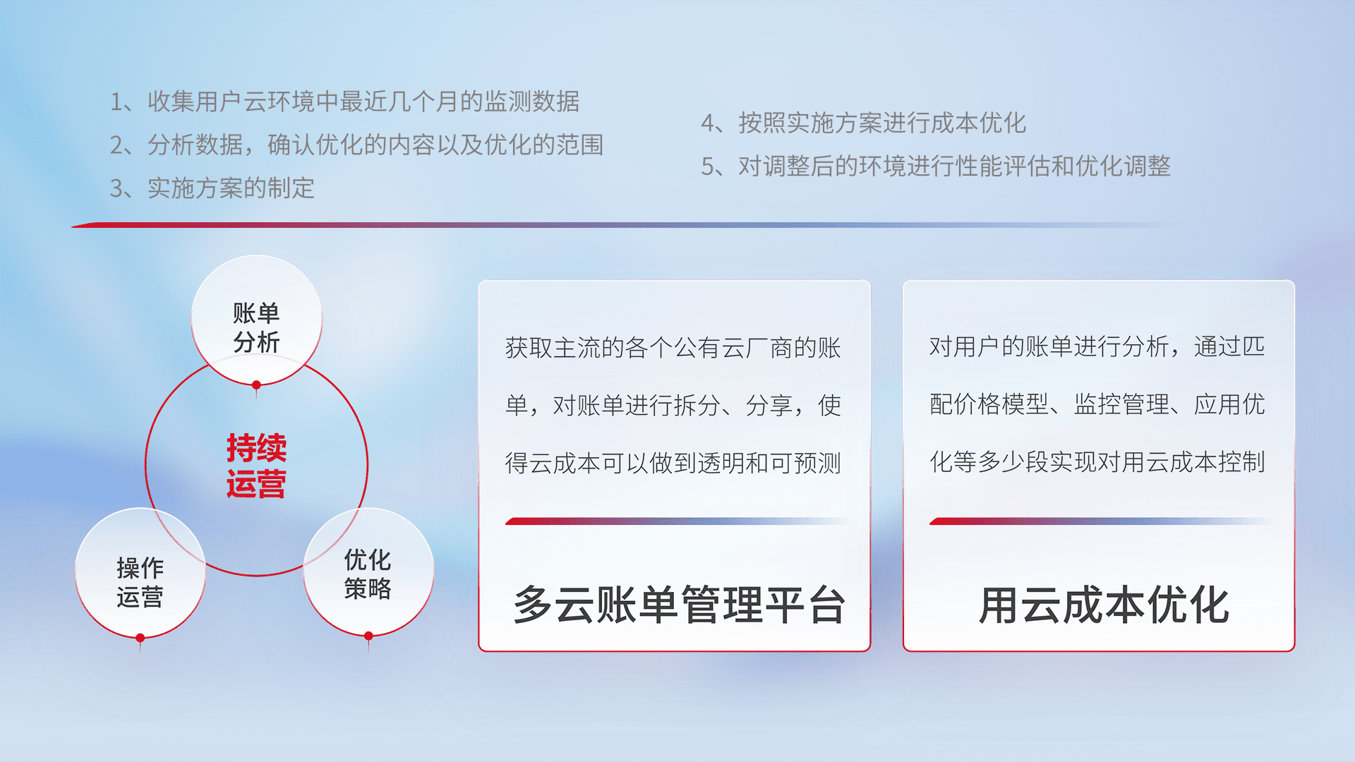 通过多云纳管,,,以统一的资源数据模型把客户的云资源进行抽象和封装,,,进而实现对多云资源的统一操作,,,保障云资源管理的可靠性、、、稳定性与可用性。。量身定制化运维内容,,,配置、、开发运维、、补丁管理、、、备份、、、监控、、、认证和访问管理、、、、审计和日常巡检等,,保障在用云过程中的可靠度,,,稳定度以及高可用率。。。。