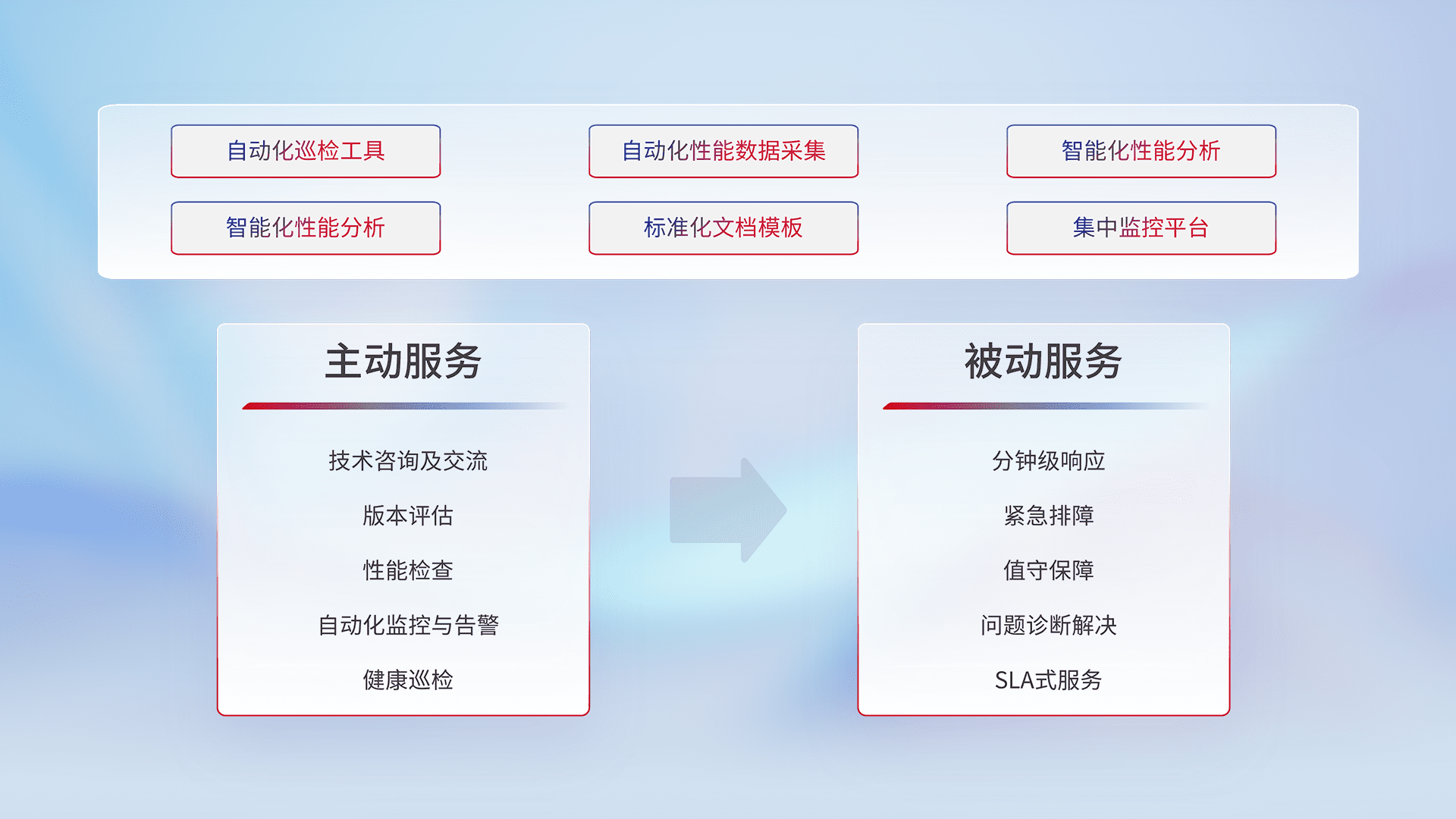 智能化工具和标准化文档,,保障服务质量,,提供主动服务(包含技术咨询、、、、版本评估、、、性能检查、、、、自动化监控与告警、、、、健康巡检)和被动服务包含(分钟级响应、、紧急排障、、、、值守保障、、、、问题诊断解决、、、、SLA服务)。。